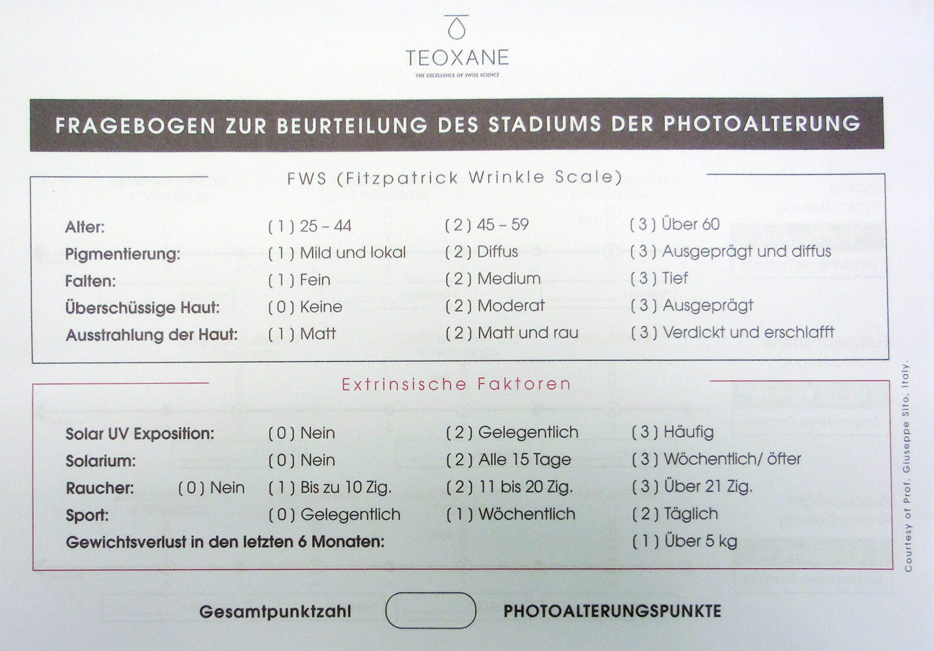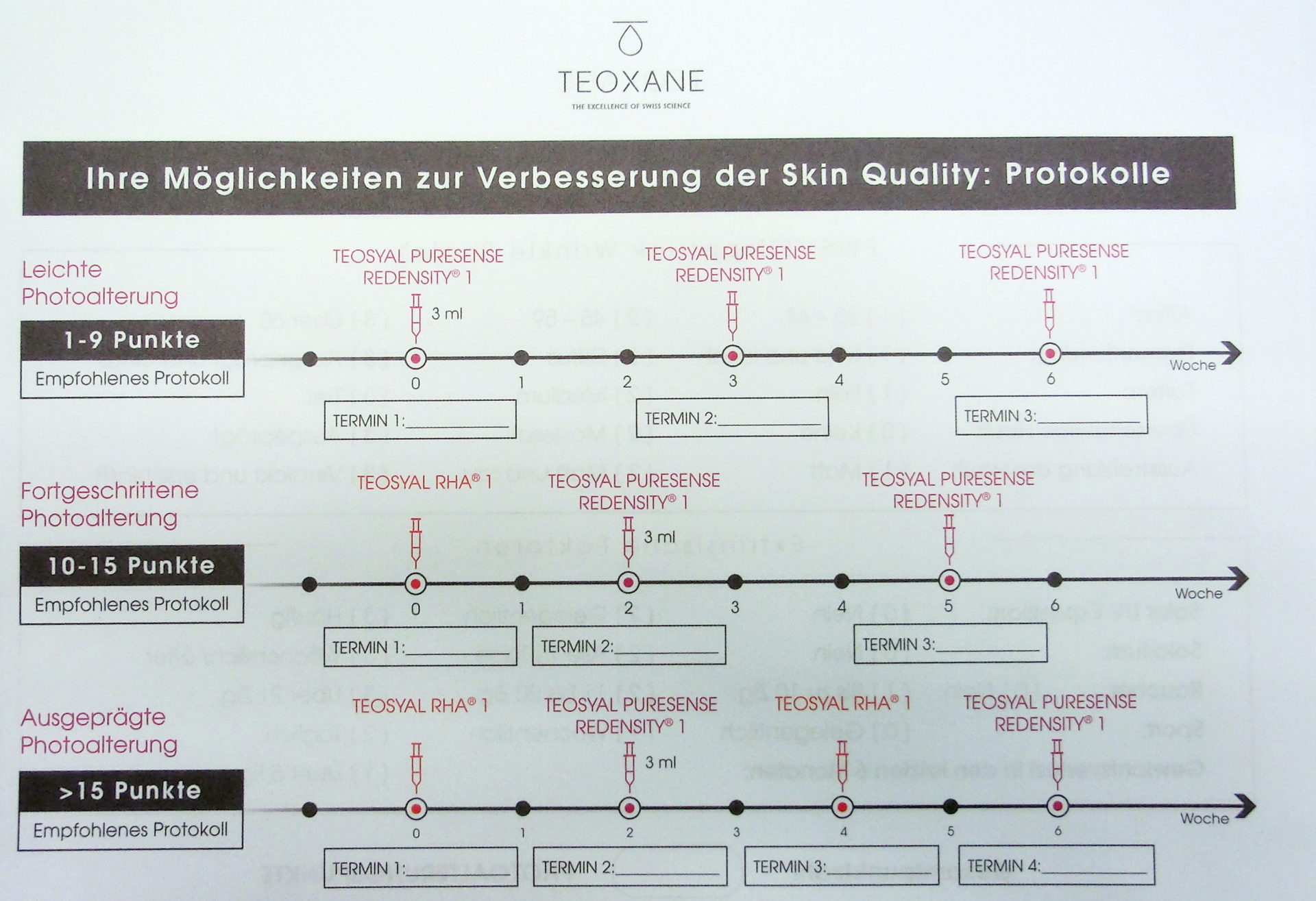 Die Firma Teoxane hat zusammen mit internationalen Experten, ein genau auf die Bedürfnisse des einzelnen Patienten ausgerichtetes Behandlungsschema entwickelt. Dazu wird vor der Behandlung anhand eines Bewertungscores eine Punktzahl ermittelt, die dann 3 verschieden intensive Behandlungsschemata vorgibt. Der Vorteil ist, dass die Behandlung genau auf den Hautzustand des einzelnen Patienten abgestimmt ist und dann eine optimale Wirkung entfaltet. Dazu werden die Präparate Teosyal Redensity 1 und RHA 1 in definierten Abständen und Wiederholungszyklen am Patienten verabreicht.